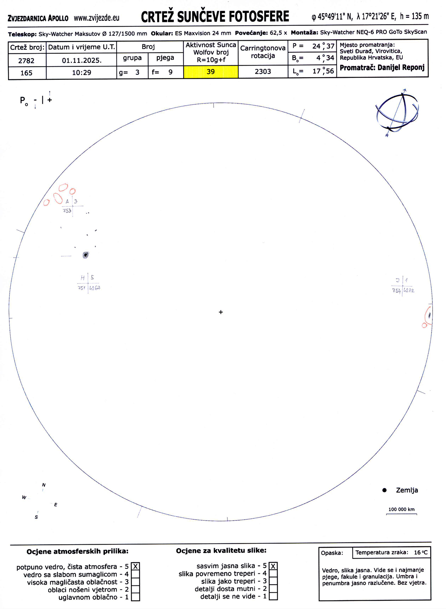 Za razliku što vidimo na astrofotografiji, evo i crtež Sunčeve fotosfere kakve astronomi koriste za izračunavanje aktivnosti Sunca. Primijetite da su na njemu prikazane i one najsitnije pjegice koje se ne vide na gornjoj astrofotografiji. Pokazuje da tehnika koja nam služi za snimanje nije baš svemoćna, naše oko i dalje uočava detalje koji kamerama promaknu. Strane Sunca na crtežu su “flipnute” jer okular teleskopa koji se koristi okrene sliku pa lijeva postane desna i obratno. To je zato što optički elementi u okularu prelamaju svjetlost na takav način. Ništa posebno, u astronomiji je to sasvim normalno, a u svemiru ne postoji gore-dolje-lijevo-desno.